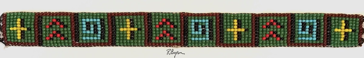 First, a beaded strip containing the symbols of the ancient elements: Earth, Fire, Air, and Water. (A clue: earth is the brown strip that envelopes the others.)