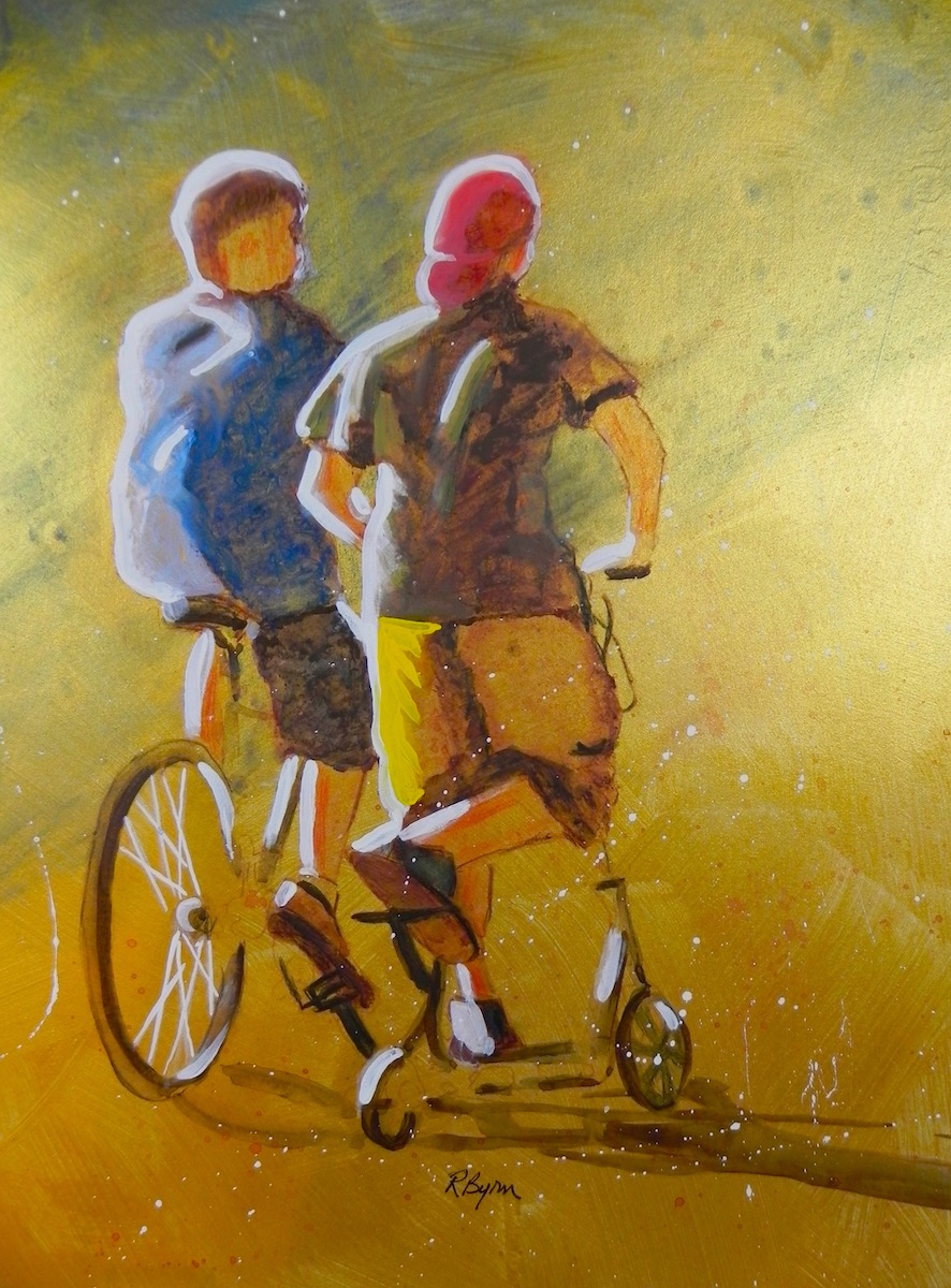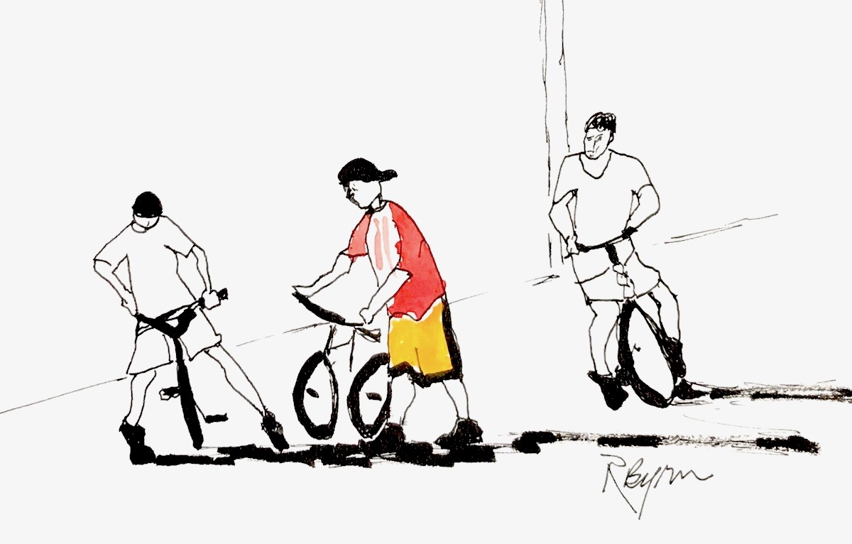 It is the second Saturday after the schools let out for summer. The streets in my neighborhood are extra friendly to pedestrians and riders of non-motorized wheeled things. Pre-teen boys especially appreciate the locale, and I’m hoping some will ride by and grace the view out there. Last year a small group met up at the intersection near my house most of the Saturday mornings of the season. Boys of any age don’t much hold still, but I did manage to get this sketch of them.