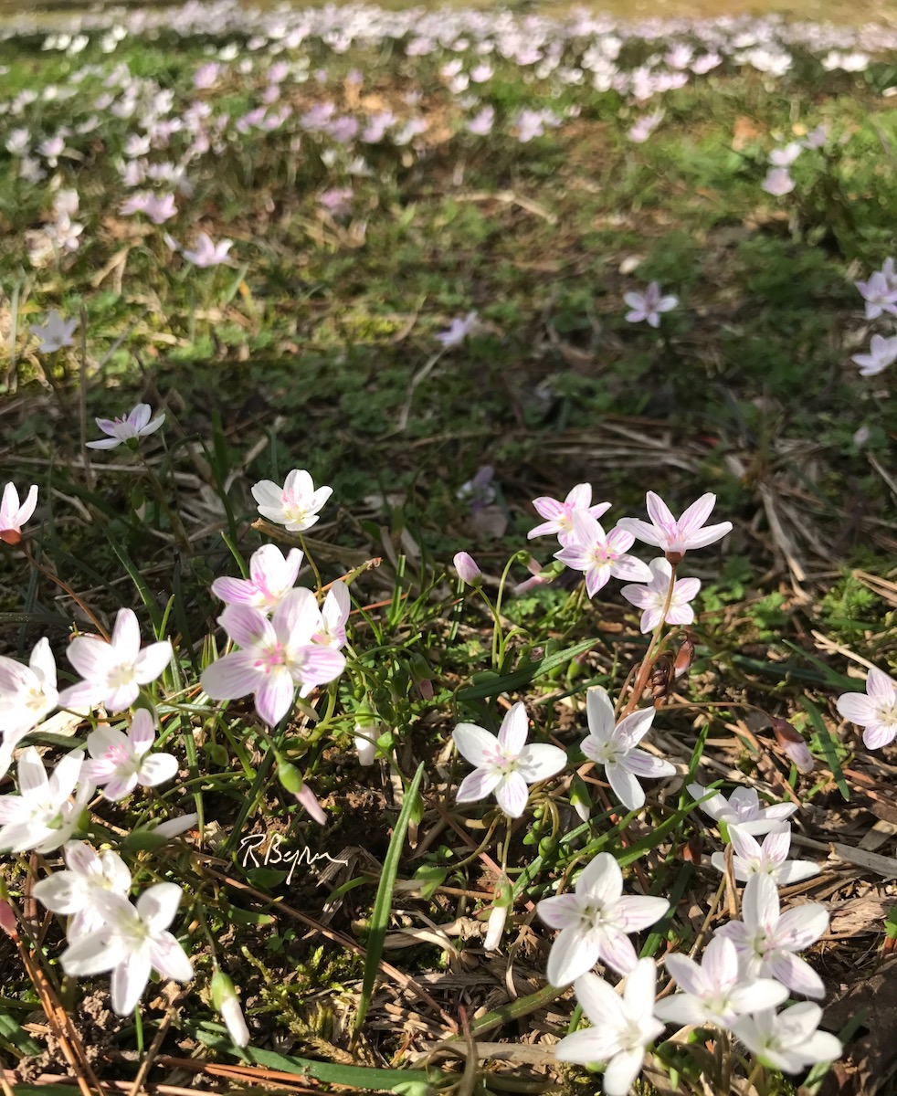 So far this year the backyard flowers have been Carolina Spring Beauty–here is an on-site photo of those from this year– plus Jonquils, Dogwood, Dandelions, Azaleas, Fleabane, Iris of three kinds, Hyacinth, Henbit, Violets, Roses, and Wild Strawberry blooms.