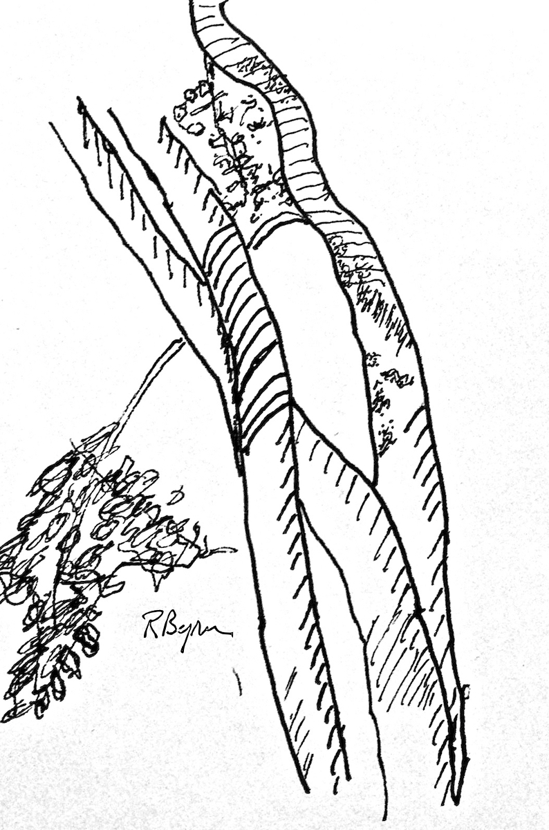 The one dogwood tree is old and elegantly thin. Having already quietly bloomed and finished, it is putting out leaves. Companion to the dogwood is its contemporary, a crape myrtle with multiple trunks, each six inches thick. The color of the trunks is unnameable, a neutral soothing color. Two of them have twined around each other. They will put out their watermelon-colored blooms later in the year when the sun rises higher.  Four large oak trees survive to live inside the fence. A years-old thick wild grape vine has formed an arbor at a far corner.