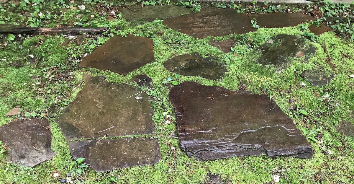 Leading out from the house into all this (and back in) is a short stretch of flagstones with moss of a refreshing lime color that couldn’t live with more sun.