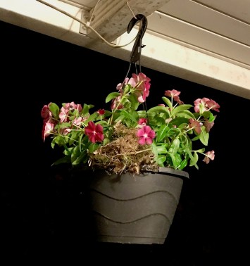 Also three new annuals bloomed this week, and something ate one of them too. That flower was a double daylily which I’ve not seen before in the Green Cathedral. Its predecessors in past years have been single lilies, and I have no way to account for this one unless it is a new volunteer plant. Here it is in full bloom three mornings ago, and  . . .