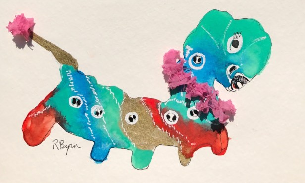 She’s basically the shape of a tomato hornworm but her skin is made of swathy pastel blues, turquoises, golds, and red-golds. She hunches herself toward the crowd, two yards per hunch, and when she arrives all the people turn away from staring down at the water where Mistakes Man was. We gather behind Do Over and follow her toward our dwellings and our festival suppers. We are singing a cappella a sweet simple folk song as the sun goes down.