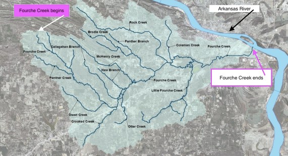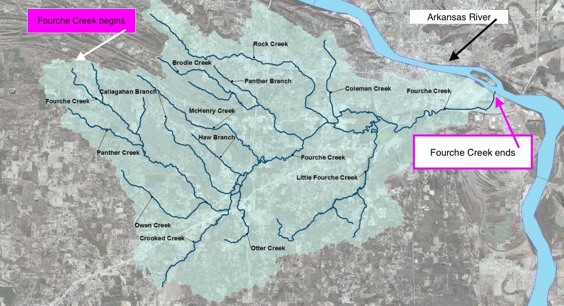 This map shows Fourche Creek and its tributaries, starting in Saline County, flowing east through Little Rock, and emptying into the Arkansas River.