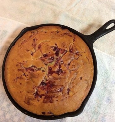 Back at home we feast, of course, trying not to gobble the main courses too fast in anticipation of our traditional Do Over Day dessert. The Mommyselves have made it ahead of time in skillets handed down through the generations. And finally here it is: Raspberry Swirl Cake!