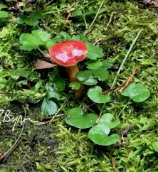 So. Lots of moisture in the back yard, the Green Cathedral. Yesterday morning Beloved Doggie and I waited until the rain stopped and then stepped outside. Here is the little surprise jewel who said hello to me from its new place between the wet flagstones. It was less than an inch wide. (The green leaves that look like a pony’s foot are called, guess what, ponysfoots, officially named dichondra.) By nightfall some small critter had taken two bites out of the pretty mushroom and kicked it off its stalk, maybe in a twit. I hope the biter didn’t get sick. I think the mushroom is Russula emetica, one of the digestively disagreeable kind, though not deadly.